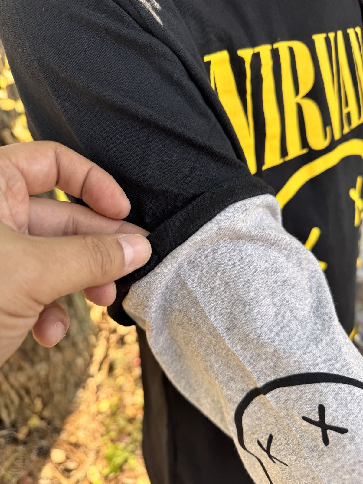 送料無料 NIRVANA / Yellow Happy Face 長袖Tシャツ BLACK/GREY