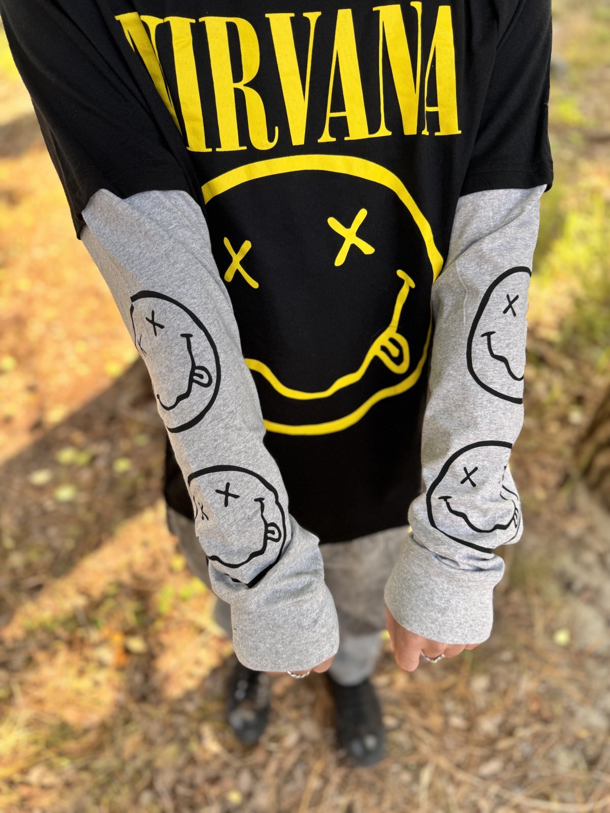 送料無料 NIRVANA / Yellow Happy Face 長袖Tシャツ BLACK/GREY