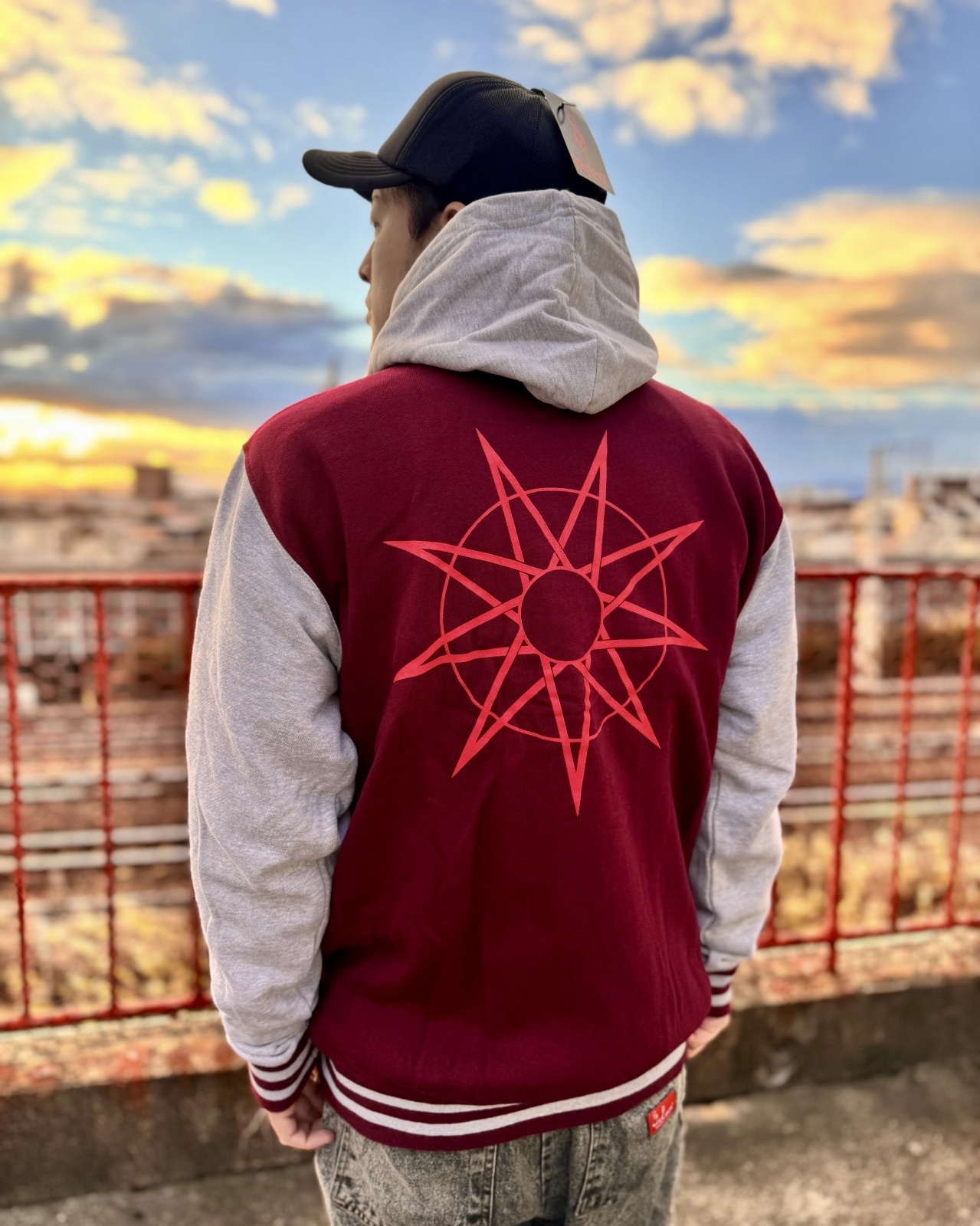 バックは赤の九芒星プリントで